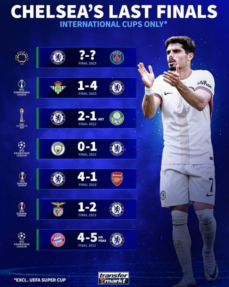 直播吧7月12日讯 世俱杯决赛将在巴黎与切尔西之间展开,德转也盘点了切尔西近6次国际杯赛决赛的全胜表现(不包括欧洲超级杯):